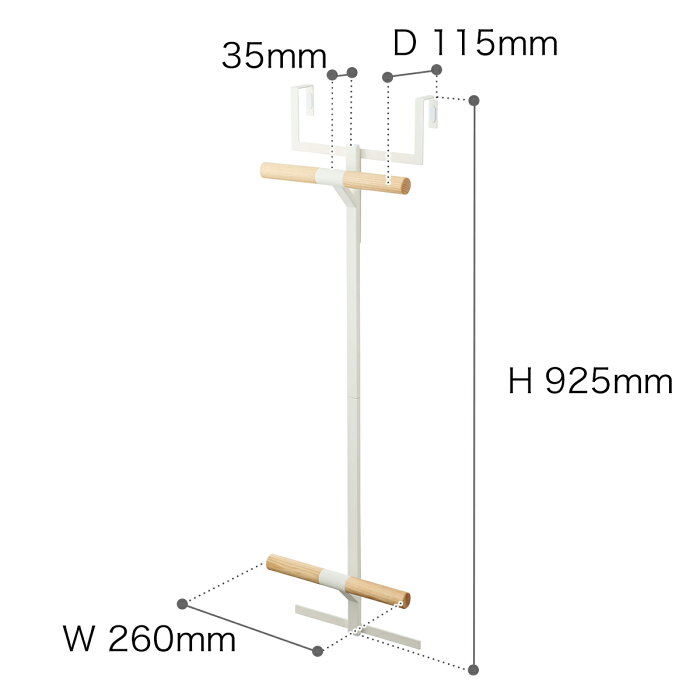 品番 5244 / 5245 サイズ 約 幅 260mm×奥行き 115mm×高さ 925mm バー直径:約 25mm 上部ハンガーと下部ハンガーとの間隔:約 625mm 重さ 約 916g 素材 本体:スチール( 粉体塗装 ) バー:天然木( ラッカー塗装 ) キャップ:ポリプロピレン 滑り止め:シリコーン、EVAフォーム 耐荷重 バー1本あたり:約 5kg 取り付け可能な場所 ドア、折れ戸の幅:約 26cm以上 ドア、折れ戸の厚さ:約 2〜3.5cmまで ドア、折れ戸の上部との隙間:約 3mm以上 付属品 六角レンチ 備考 ・組立式 ・ガラス扉への取り付け不可 ご注意 ※サイズは個体により若干差異が生じることがあります。