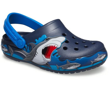 crocs FUN LAB SHARK LIGHTS CLOG KIDS 商品説明 バンドにサメのグラフィックとライトアップが 楽しいキッズサイズのクロッグ。