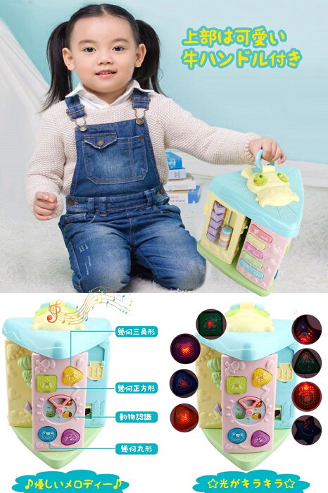 9面の遊び方 動物幾何:4つの幾何ボタンを押すと、別々の光と音楽を放送 窓をあ上げる:窓を上げると、可愛い牛が出だ さかなを吊る:可愛いさかなを下を引っ張て後、自動的に上を泳ぐ 動物ターンテーブル:三角形をとこに回すと、対応した動物の音が流れと光を点滅 ボールゲーム:ゴロゴロなる音、子供の楽しみを引き付ける そろばん:回転可能な正方形の各面は果物と数字と加減算記号のパターンがある、カラフルなそろばんで子供は算術を模倣することができる カラフルなキーボード:5つのメロディーがある、ピアノを弾くをできる ドアを開ける:ドアを開けると、可愛いイラストが出だ 風船を上昇:可愛い人を下を引っ張て後、自動的に徐々に昇る 商品詳細 商品名:多様化おもちゃ 重さ:0.9kg サイズ(約):20.5cm×19cm×28cm 適応年齢:1歳以上〜 商品素材:食品級のABS、電気部品 商品電源:単三電池×2(電池別売り) 注意 ※メーカーによる商品改良或いは包装変更のため予告なく仕様変更となる場合がございます。